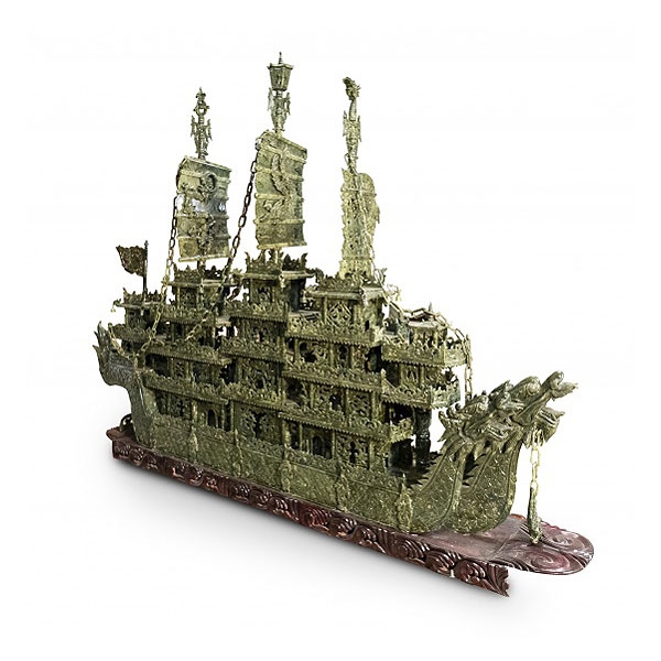 Monumental barco chino en serpentina tipo jade tallada, del siglo XX