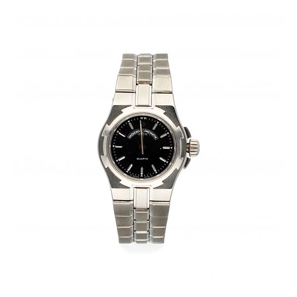 Caja de acero tamaño de señora 24mm con brazalete de acero y cierre desplegable doble oculto. Esfera negra. Incluye estuche original. Precisa cambio de pila.