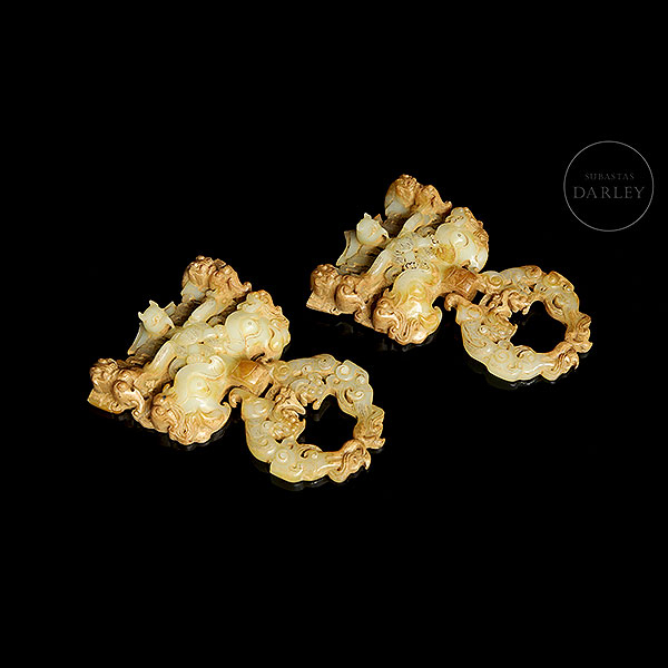 Pareja de aldabas finamente talladas en jade amarillo con zonas de pátina marrón. Cada pieza presenta una estructura principal en forma de escudo de perfil sinuoso, decorada en altorrelieve con un motivo central antropomórfico alado, que recuerda a un fénix estilizado, flanqueado por representaciones de bestias mitológicas y elementos volutas. La parte inferior de cada aldaba se completa con un aro móvil, ricamente tallado con motivos de nubes y dragones arcaicos entrelazados. El trabajo del jade presenta zonas suavemente pulidas y otras más rugosas debido a la alteración superficial del material, probablemente derivada del paso del tiempo. En el reverso se aprecia un botón de sujeción central y perforaciones irregulares que sugieren un método funcional de anclaje. Dinastía Han (206 a.C.–220 d.C.) o posterior.