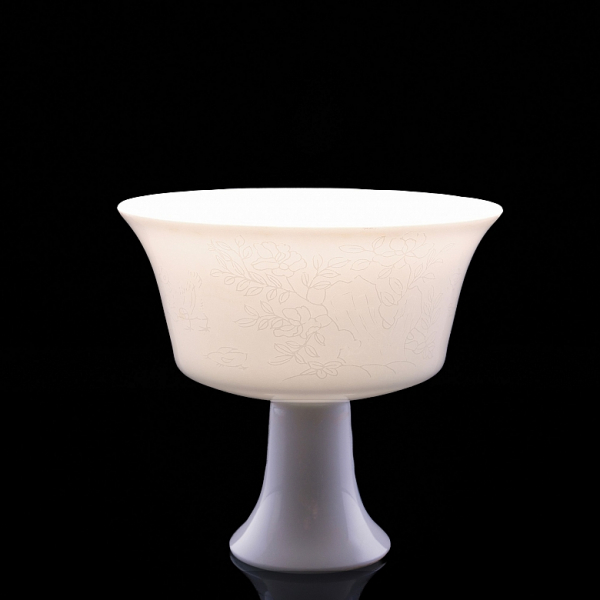 Taza de porcelana compuesta por dos cuerpos unidos: uno principal y una base. El cuerpo principal es troncocónico invertido, con los bordes ligeramente abiertos hacia el exterior. La base, también troncocónica pero no invertida, es alta y estilizada, lo que da a la pieza una apariencia similar a una copa. Esmaltada en blanco, presenta una decoración grabada, que se aprecia al ser atravesado por la luz, que representa múltiples aves, como un gallo, una gallina y varios polluelos. La escena está enmarcada por elementos vegetales.