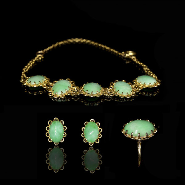 Elaborados en oro amarillo de 18k. Cada pieza está decorada con jadeítas de tonalidad verde translúcida, talladas en forma oval y montadas en garras, rodeadas con delicados detalles decorativos en filigrana. La pulsera está compuesta por cinco jadeítas engarzadas en marcos de oro, unidas por una fina cadena de eslabones. El anillo y los pendientes siguen el mismo estilo. Adjunta certificado geológico emitido por W.G.I en el año 2021.