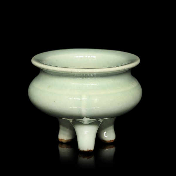 La pieza está cubierta por un esmalte de color verde celadón con un fino craquelado, propio de las producciones de Longquan. La base de las tres patas se han dejado sin esmaltar, revelando la cerámica de tono rojizo. Dinastía Ming (1368-1644) o posterior.