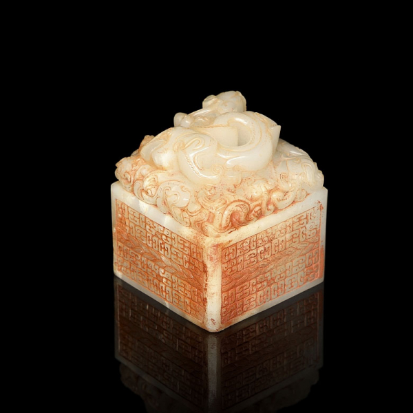 Jade de color blanco cremoso con vetas rojizas. La pieza, de base cuadrada, está coronada por un remate magistralmente tallado en alto relieve y calado, que representa un nido de dragones chilong entrelazados.