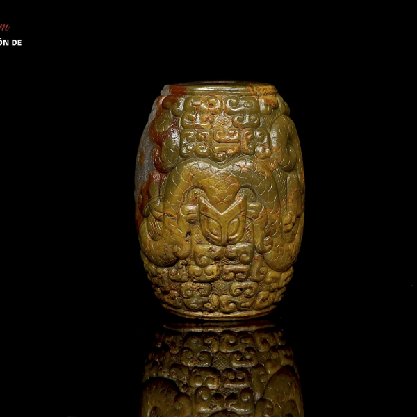 La cuenta está tallada en Ágata de tonos amarillo-verdoso y rojizos. La superficie está completamente cubierta por relieves de dragones Chilong de cuerpo serpentino entrelazados alrededor de la pieza, que destacan sobre un fondo de volutas y patrones geométricos incisos. Período Reinos Combatientes (c. 475-221 a.C.) o posterior.