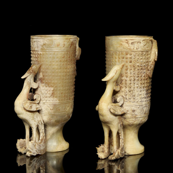 Cada pieza presenta un cuerpo cilíndrico esbelto que se ensancha ligeramente hacia el borde, sostenida por un pie acampanado. Destaca por su excepcional decoración: el cuerpo central está cubierto por un tupido patrón de granos en relieve, flanqueado por bandas horizontales de grecas incisas. En uno de sus laterales, se encuentra magistralmente tallada en alto relieve la figura de un fénix que actúa como asa decorativa. Este tipo de copas rituales eran objetos de altísimo estatus en la corte, utilizados en ceremonias oficiales y banquetes imperiales. Dinastía Han (206 a.C. – 220 d.C.) o posterior.