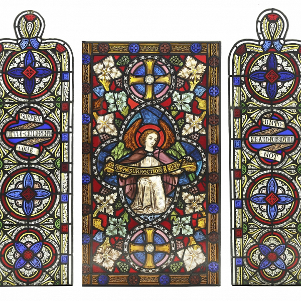 Tríptico de vidrieras emplomadas de formato vertical, realizado por la prestigiosa manufactura inglesa Shrigley and Hunt. La composición se divide en tres paneles.