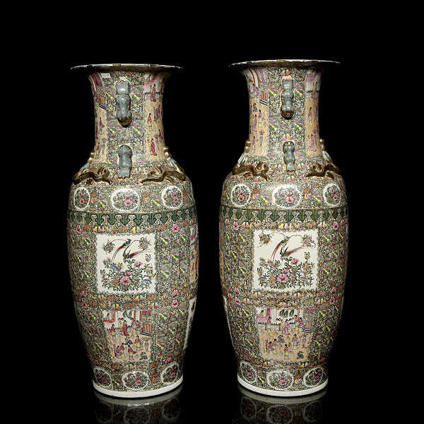 Pareja de grandes jarrones de porcelana familia rosa "Aves", Cantón, pps. s.XX.
