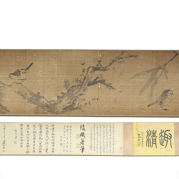 Tinta y pigmentos sobre seda y papel. Se compone de un total de cuatro secciones, con una alargada pintura que muestra un calmado paisaje, donde pequeñas aves reposan entre ramas y rocas.