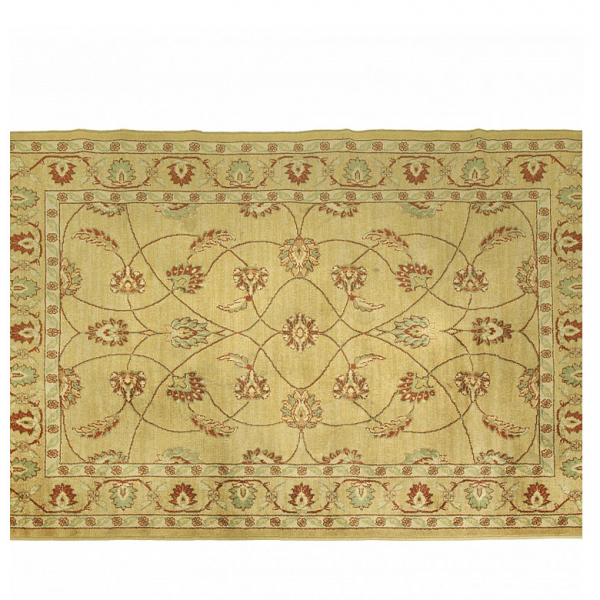 Alfombra de lana anidada, de tonos ocres sobre los que destacan decoraciones de patrones florales entrelazados.
