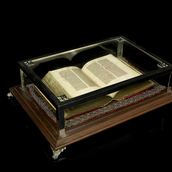 Libro facsímil de la biblia de San Vicente Ferrer. Publicado por Scriptorium, S.L. en ediciones limitadas, este libro facsímil forma parte de una edición de lujo de 980 ejemplares, siendo este numerado por notario como "50/980". Al igual que en el manuscrito original, actualmente conservado en el archivo de la catedral de Valencia, el facsímil recopila las anotaciones realizadas por el santo hace más de 600 años. Ejemplar de tapa dura presentado en una vitrina de cristal.