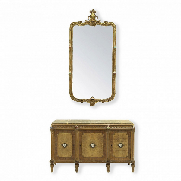 Conjunto de recibidor de madera y porcelana, s.XX. Conjunto recibidor, conformado por un mueble rectangular, de tres puertas y un espejo de madera tallada y dorada.
