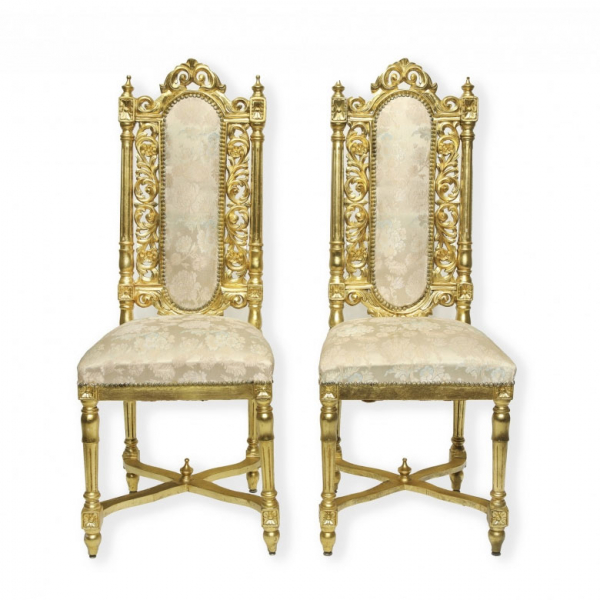 Dos sillas de madera decoradas mediante la técnica de doradura.