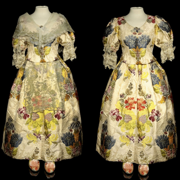 Indumentaria tradicional valenciana o "traje de fallera" perteneciente a la fallera mayor "Mª Luisa Aranda" de valencia en los años 1939 y 1940.