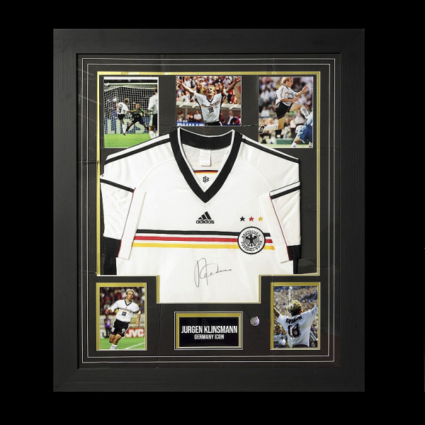 Camiseta enmarcadade la selección Nacional Alemana, firmada por Jürgen Klinsmann con certificado de autenticidad. Jürgen Klinsmann es un exjugador y entrenador de fútbol profesional alemán. Jugó para varios clubes importantes de Europa.