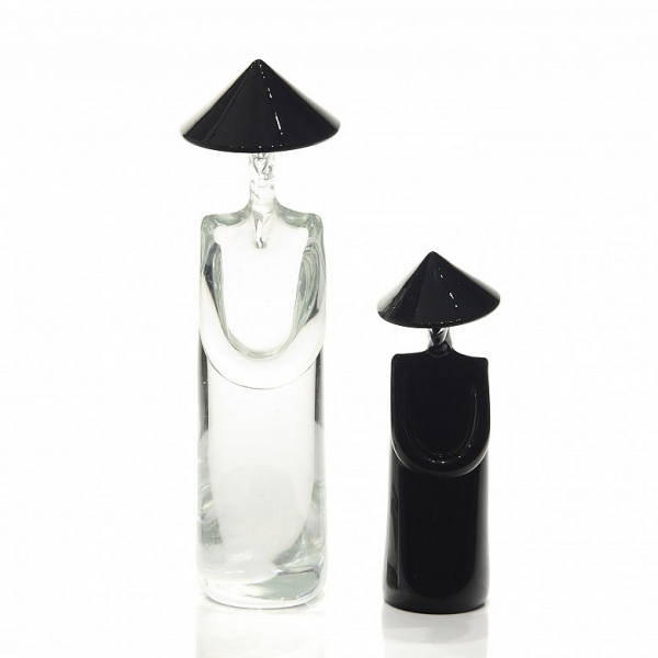 Pareja de personajes de cristal de Murano con sello "Archimede Seguso/Murano/Made in Italy". Realizados a partir de cristal translúcido y negro mediante la técnica de cristal soplado.
