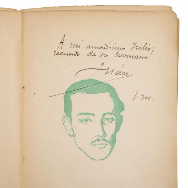 8º, cub. (fatigadas, con faltas marginales y lomera perdida) bl. + 7 h. + 114 pgs. + 5 h. + bl. Primera edición, muy rara. Dedicatoria autógrafa del autor "A mi amadísimo Julio [Pellicer]; recuerdo de su hermano, Juan. 1900".