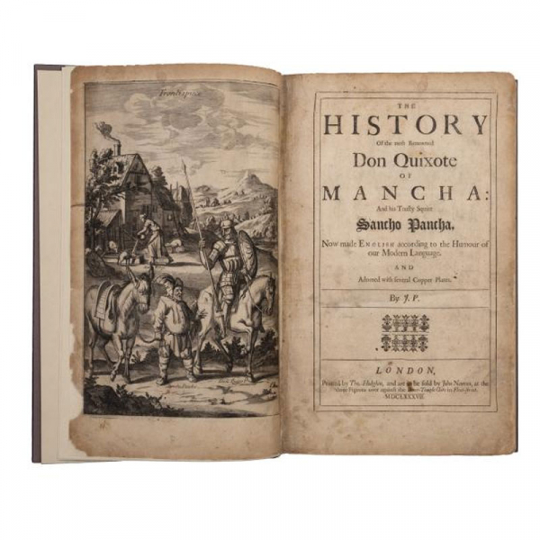 "THE HISTORY OF THE MOST RENOWNED DON QUIXOTE OF MANCHA: and his trusty squire SANCHO PANCHA" London: Tho. Hodgkin, 1687. Folio menor, plena piel post., con tejuelo rotulado en la lomera. Frontis grab. + port. + 8 h. + 616 pgs. + 2 h. Frontis + 8 láminas grabadas al cobre, cada una de ellas con dos viñetas. Aunque Palau reseña 12 láminas, los ejemplares que consultamos coinciden en número de láminas con el nuestro. Papel naturalmente tostado; alguna restauración marginal. Palau 52465.