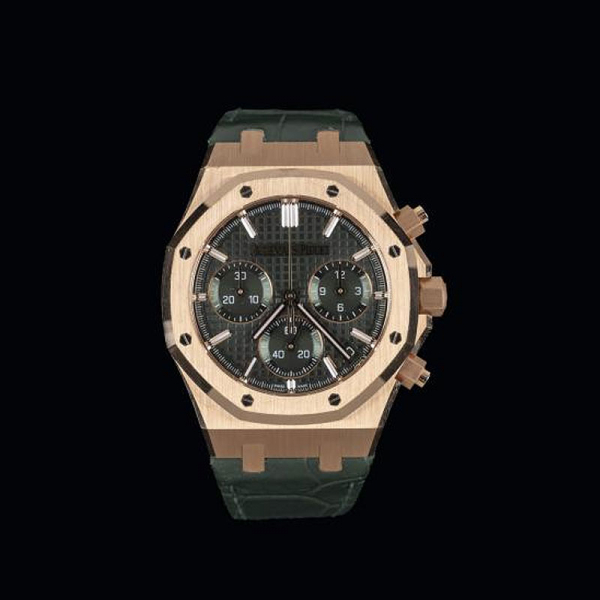 Movimiento automático en estado de marcha. Cronógrafo y calendario. Correa de piel verde con cierre desplegable de oro rosa. Maquinaria visible en la trasera. Con caja, estuche y tarjeta de garantía. 41 mm.