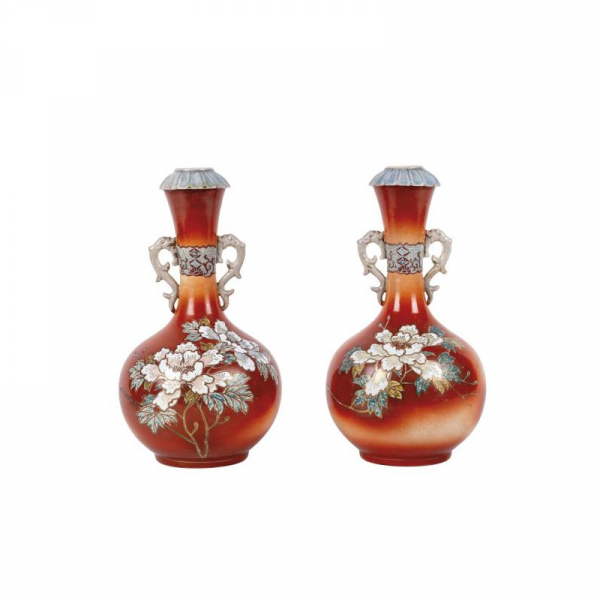 Pareja de jarrones japoneses en porcelana esmaltada y vidriada. Decoración floral y de motivos vegetales. Japón, Ff. S. XIX - Pps. S. XX.