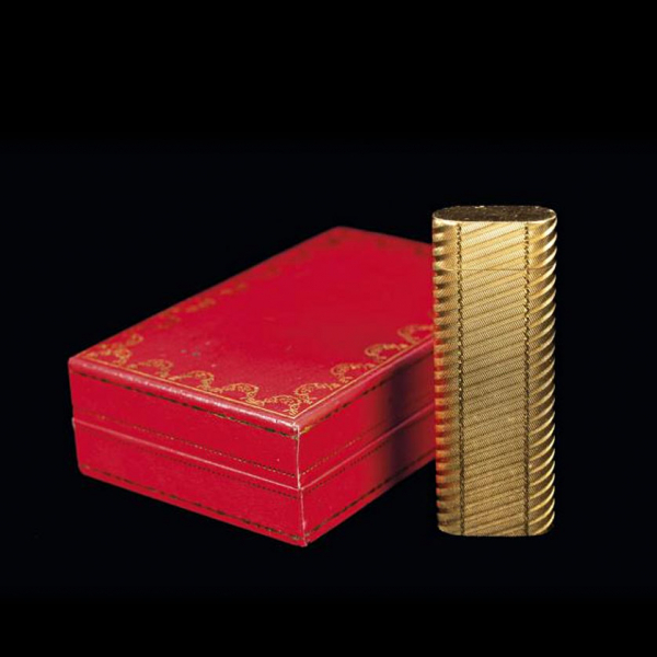 Encendedor de bolsillo CARTIER "Must", en plaqué de oro amarillo con estuche y garantía.