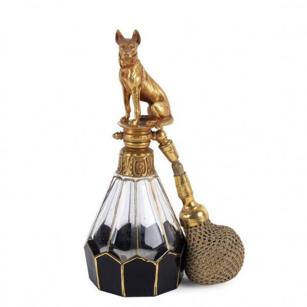 Exquisito perfumero francés Art Decó realizado en cristal en su color y doblado en negro, y bronce dorado al mercurio. Decorado en la parte superior con la figura de un perro Pastor Alemán. Circa 1920.