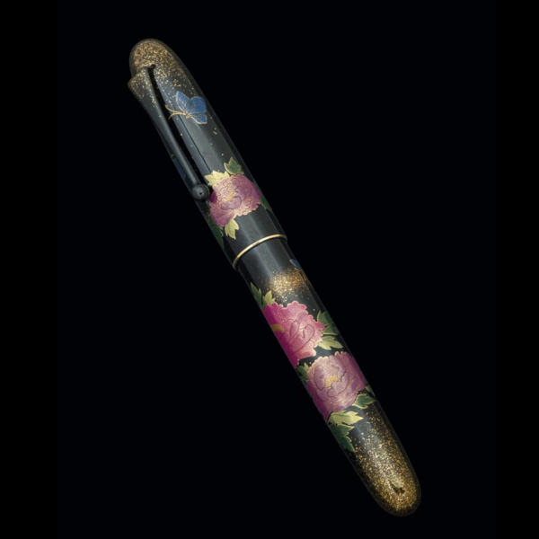 Estilográfica marca NAMIKI, modelo Peony and Butterfly, tamaño Yukari Royale, realizada en técnica Maki-e, Togidashi Taka Maki-e, firmada por el artesano Misa Seki. Plumín de oro.