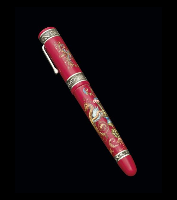 Estilográfica Kynsey roja con miniatura rusa y aros de plata.