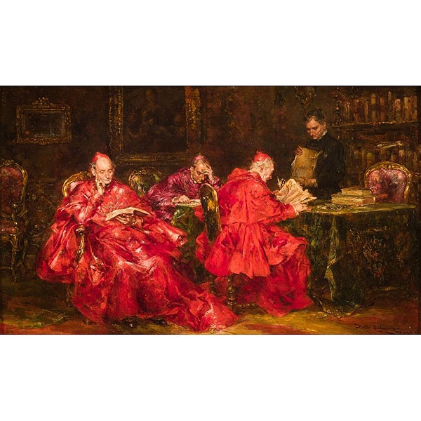 "La lectura de los cardenales". Óleo sobre tabla. Firmado y localizado (Roma) en el ángulo inferior derecho.