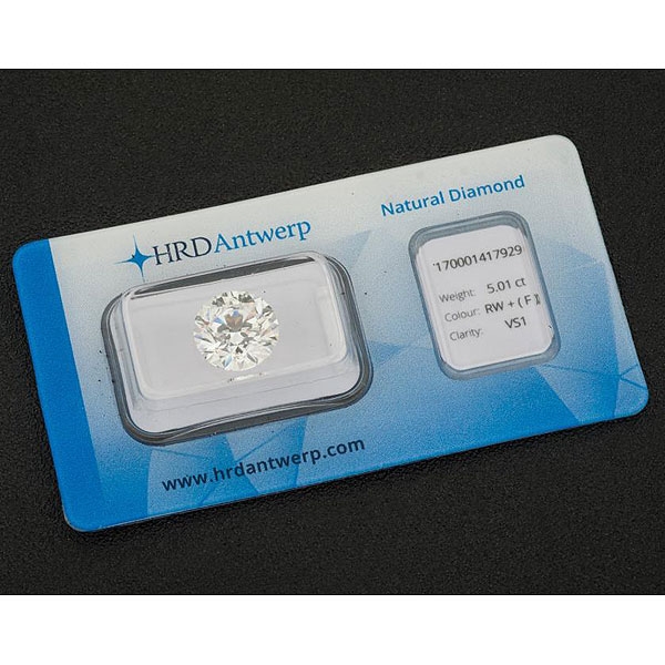 Diamante talla brillante de 5,01 cts. Color: F. Pureza: VS1.