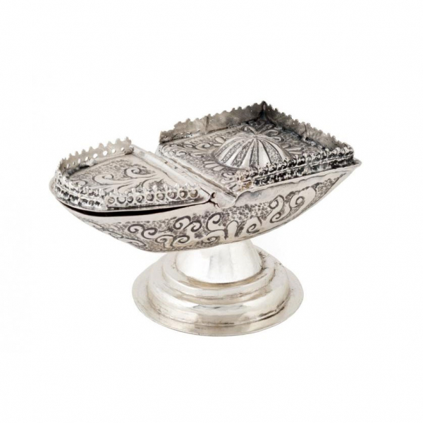 Naveta realizada en plata española sin punzón visible. A modo de barco, con decoración vegetal grabada y barandilla en la parte superior.