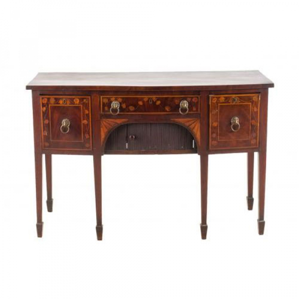 Aparador de estilo Hepplewhite Inglaterra, circa 1900. Realizado en madera de caoba tallada y chapeada. Con marquetería en maderas finas de motivos florales.