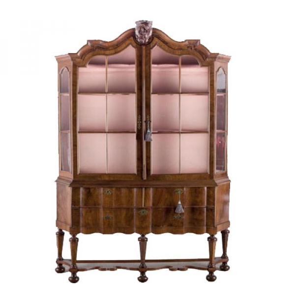 Vitrina de estilo holandés. Madera de nogal. Antigua. Formada por un cuerpo bajo, de perfil ondulado, que lleva tres amplios cajones distribuídos en dos registros, y uno alto que es la vitrina, de puertas acristaladas.