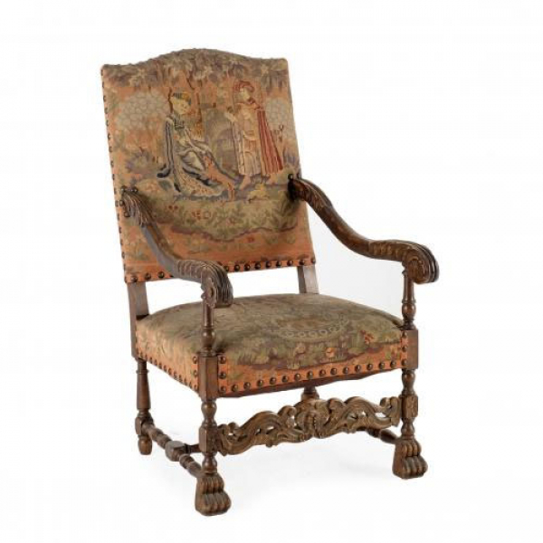 Patas en garra. Tapicería Aubusson tachueleada mostrando una escena galante. Ff. S. XVII. 115 x 80 x 65 cm