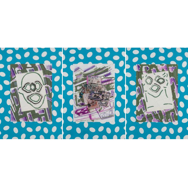"Sin título (2002)". Técnica mixta (acrílico, collage, y gouache) sobre impresión digital en Dibond. Firmado y fechado (02) en el panel central. Los tres paneles firmados en el ángulo infeior derecho (G).