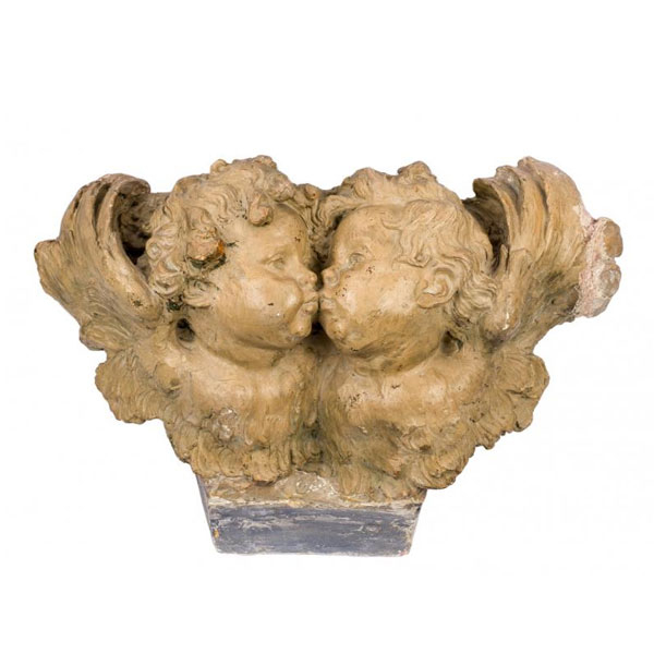 Estudio para capitel realizado en escayola pintada en color crema oscuro. Se compone a partir de dos cabezas de querubín en actitud cariñosa.