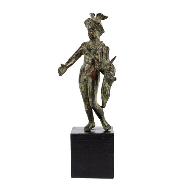 Su cabeza, con los petasos alados, girada a su derecha. Sostiene una bolsa de piel de cerdo con monedas en su mano izquierda. La mano derecha tenía el caduceo fundido por separado. Su himatión car del hombro izquierdo y le cubre el antebrazo izquierdo. El dios Mercurio era hijo de Júpiter y Maia Maiestas. Era el mensajero de los dioses del Olimpo, de las fronteras y de los viajeros que las cruzan, el ingenio y el comercio en general. 13,3 cm