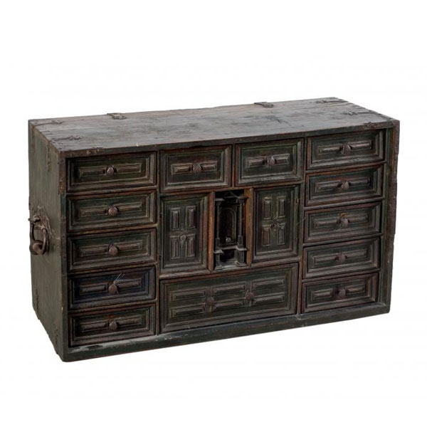 Tiradores en hierro en forma de concha. Decoración de casetones al frente. España, S. XVI - XVII. 61 x 40 x 103 cm