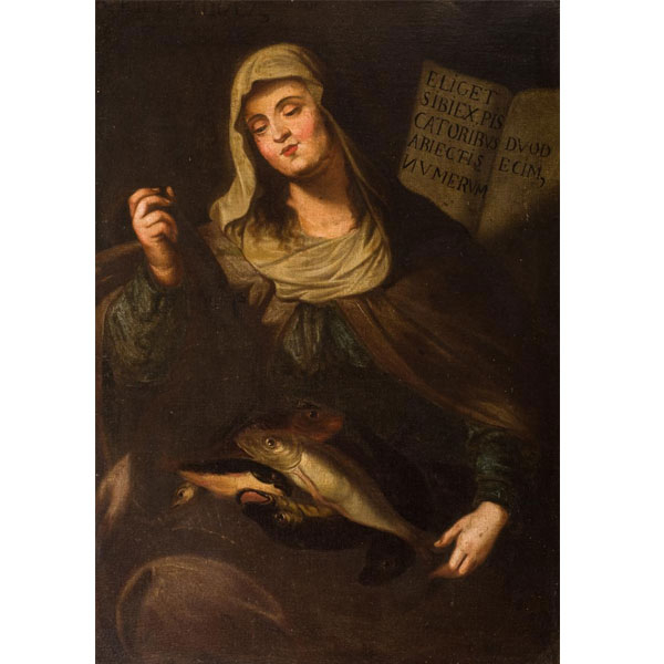 Aparece con una red llena de peces en su regazo, relacionada con el ichthus, pez en griego, cuya pronunciación es similar a la de Jesús y, además, funciona como acrónimo de Iesous Christos Theou Uios Soter o Jesucristo, Hijo de Dios, Salvador, símbolo usado desde periodo paleocristiano. Además, se observa la inscripción de su profecía en las hojas de un libro abierto en el ángulo superior derecho de la composición: eliget sibi ex piscatoribus abiectis numerum duodecim (los escogerá para sí de entre pescadores y humildes en número de doce). Por último, en el ángulo superior izquierdo, y casi inapreciable, el número 8 seguido de la identificación de la Sibila como Eritrea en letras capitales. 121,5 x 86,3 cm