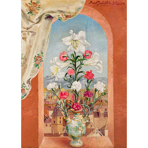 BENJAMÍN PALENCIA (1900 - 1980) "Vista de Granada o bodegón en la ventana (c. 1930)". Óleo sobre tabla. Firmado y dedicado en el ángulo superior derecho.