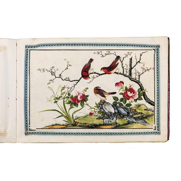 Folio oblongo, cub. de papel maché lacada en negro y dorada, con medallón central con título y autoría; sello de Velong, Cantón en el interior. Posiblemente, mediados s. XIX. Todos los papeles están rotos en las esquinas, despegados del soporte que los mantenía; algún pequeño deterioro con pérdida. Cada una representa dos o tres pájaros sobre vegetación con flores o rocas. Estupendo trabajo de muy bella ejecución consiguiendo un gran realismo en el plumaje de las aves.