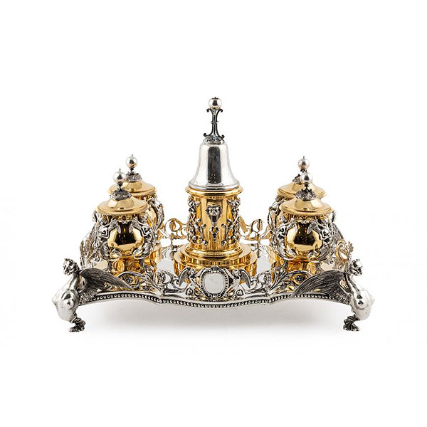 Del orbre J. R. Arellano. Profusa decoración de cariz vegetal entrelazada con ángeles músicos y animales fantásticos de bulto redondo. Con cuatro depósitos y campanilla central. España, S. XIX. Peso: 3.825 gr. 25 x 25 x 35 cm
