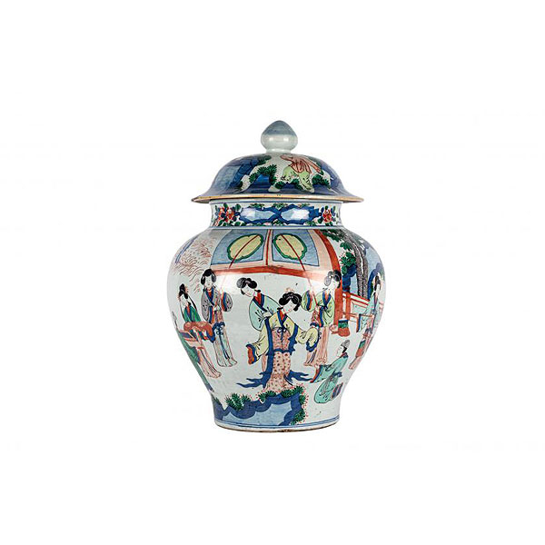 Decoración Wucaï (a cinco colores). Decoración de escena palaciega en un jardín en tonos azul cobalto, verde y rojo hierro bajo vidriado.