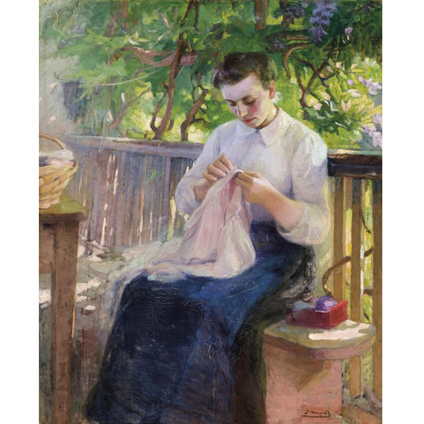 "Cosiendo en el jardín". Óleo sobre lienzo.
