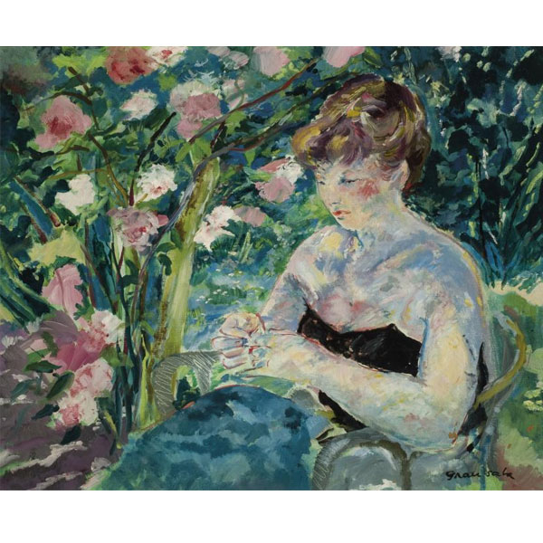 GRAU SALA, EMILIO (1911 - 1975) "Mujer cosiendo en el jardín". Óleo sobre lienzo.
