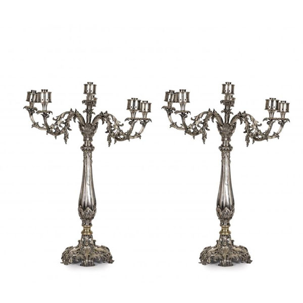 Pareja de grandes candelabros en metal plateado, posiblemente plateado inglés Sheffield de la manufactura Elkington & Co.