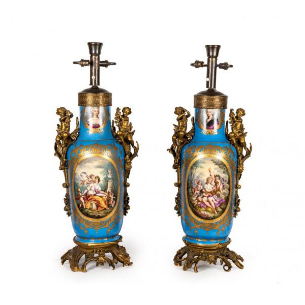 Fondo en azul pompadour con escenas en reserva que muestran alegoría de la poesía y de la música, bouquets florales, y en la parte superior, retratos de damas. Sobre fondo blanco, iniciales LF coronadas, correspondientes a Luis Felipe de Francia. Montados sobre bronce dorado con decoración de rocallas y niños.