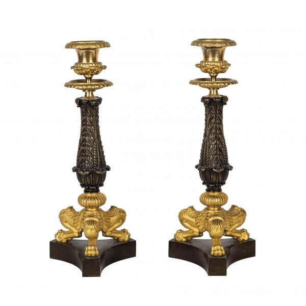Pareja de elegantes candeleros Imperio en bronce pavonado y bronce dorado al merucurio.