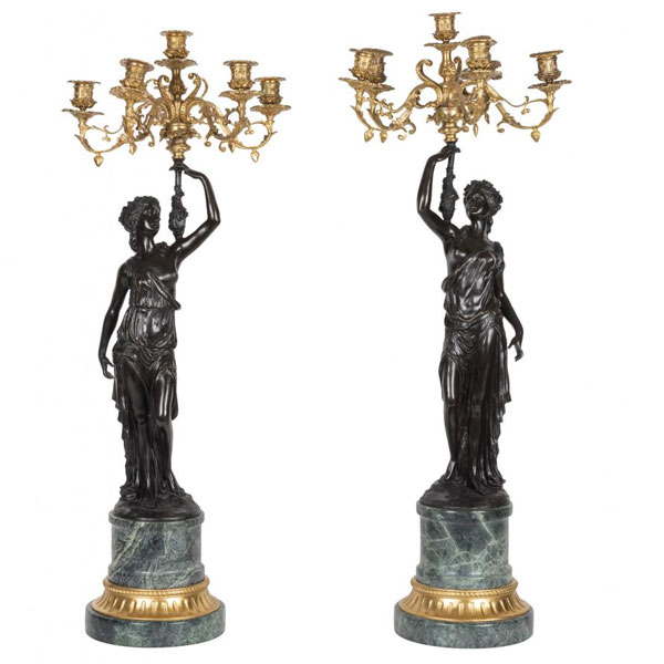Fuste a modo de damas ataviadas a la manera clásica, sobre peanas gallonadas y base de mármol. Brazos de cariz vegetal. S. XX, siguiendo modelos de Pp. del S. XIX. 92 cm de alto