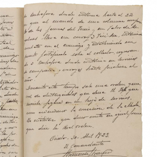 Comienza: "Empieza el año en servicios de campaña en Territorio de Melilla al mando de la 1ª y 2ª Bandera del Tercio de Extranjeros, acampado en San Juan de las Minas, donde permanece hasta el día 7 de Enero que sale para..." 5 pgs. manuscritas, autografiadas al final, fechado en Oviedo, 30 de Abril 1923.