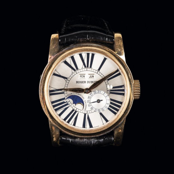 Importante reloj de pulsera para caballero marca ROGER DUBUIS, Calendario Perpetuo, modelo HO43 1439 5 3R.7A. MOvimiento 13377. Realizado en oro rosa de 18 K.
